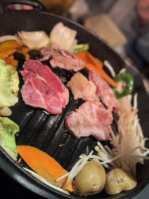 しばらくして運ばれてきたお肉は、よくあるジンギスカンのように薄切りではなく、肉厚で高級焼肉店のよう。焼き方も、部位によっては表面を焼くだけで食べれるとのことで、新鮮です。