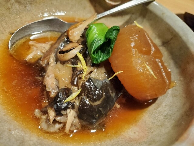 ほどなく店員さんがお通しを持ってきてくれたのでドリンクとお腹もすいてるしそのまま 骨まで食べれる寒ブリ大根 を追加オーダー