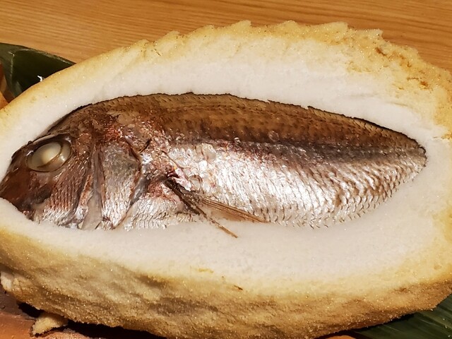 ・鯛の塩釜焼き 4人で一匹どん! ば…映える!塩釜焼き初めて食べましたが、柔らかくてジューシー そして全体に均等に丁度良い塩分…とっても美味しい!! お腹も9分目、皆で食べました☺️