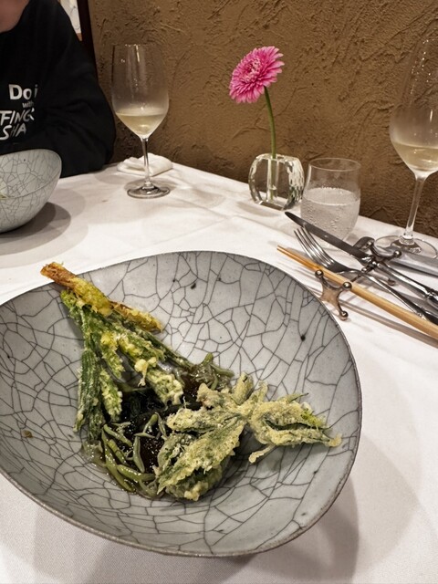 * 前菜の盛り合わせ: 旬の野菜が彩り豊かに盛り付けられ、それぞれの素材の味が引き立つ調理法で提供されました。特に、揚げたての山菜の天ぷらは、香ばしさとほろ苦さが絶妙でした。