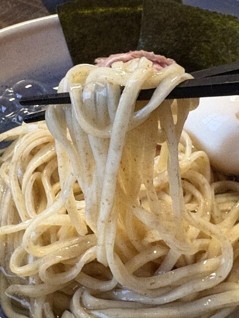 ハーフマラソンの帰りに気になっていたつけ麺屋に。つるつるの麺に塩やわさびをつけて食べますが、歯ごたえのある麺とすごくマッチしていました。蕎麦ではないでも普通のラーメンでもないです。鶏だしももちろんおい...