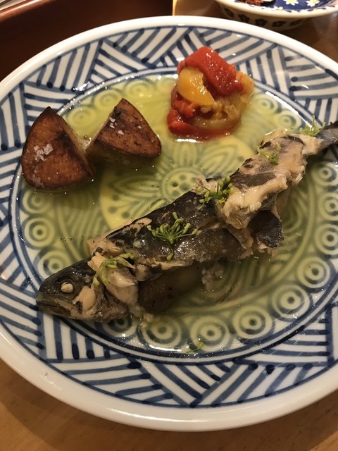 桃とブッラータサラダ、ひよこ豆のイタリアンおやき、ヤマメの白ワイン煮 、トリッパパリパリ揚げ、生ポルチーニ茸のオムレツ、魚介のタリアテッレ、ヨーグルトジェラートに、ナチュールグラスワインを数杯。