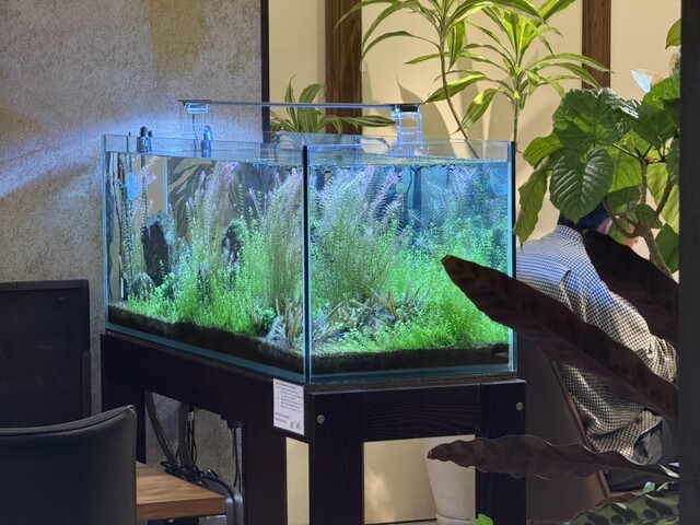 店内は、たくさんの観葉植物と水槽が置いてあり、グッピーが泳いでいます。