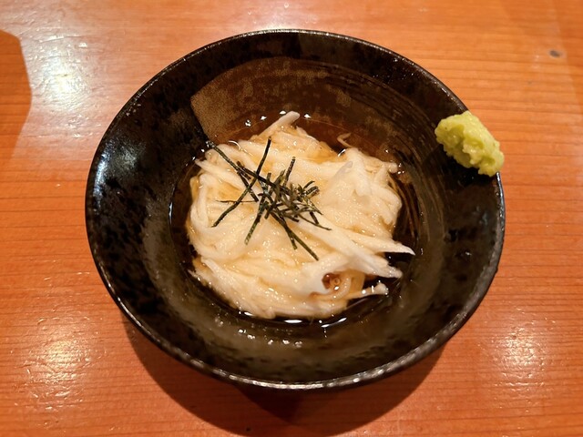 お通しは自家製揚げ出し豆腐でとろとろのお豆腐とタレがうま。レモンサワーでクールダウン夏になる味