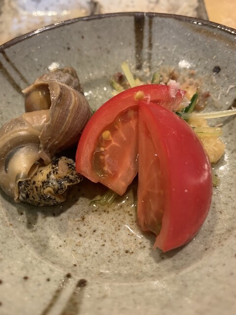 つぶ貝、水菜と揚げのおひたし、フルーツトマト