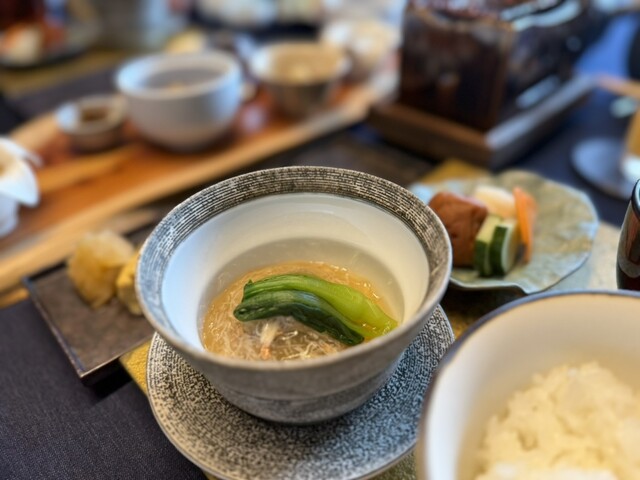 献立は、地元の素材を中心にした和朝食。炊きたての土鍋ご飯に、焼き魚、出汁巻き卵、小鉢、味噌汁など、一品一品が丁寧に仕立てられています。特に印象的だったのは、焼き魚の香ばしさと、出汁の旨味が際立つお味噌汁。野菜も宿の直営農場から届く新鮮なものばかりで、瑞々しい甘みが感じられました。