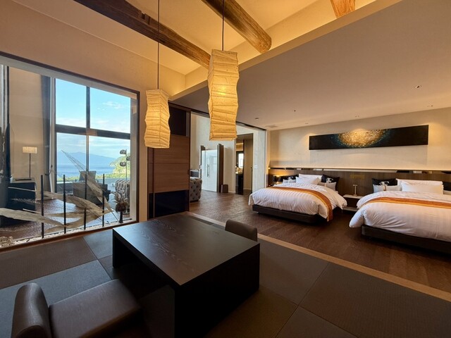 駿河湾と富士山が壮麗に広がる絶景、露天風呂とサウナ付きのスイート、ウェルカムスイーツや創作料理まで、細やかな気配りに包まれた体験ができ極上の誕生日になりました。