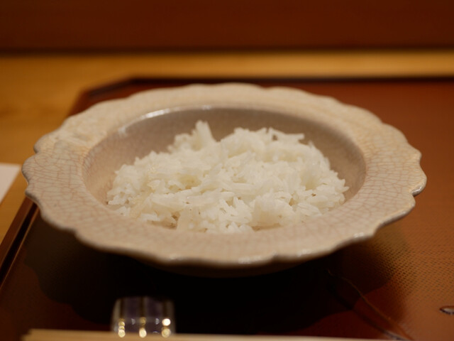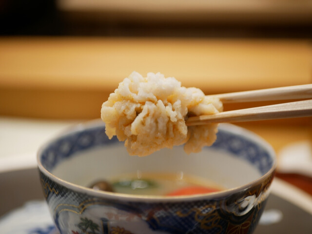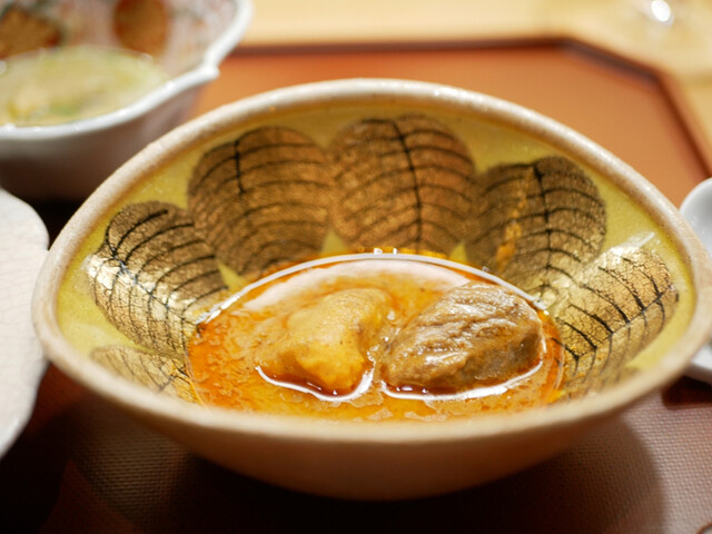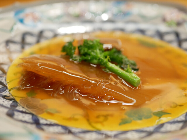 すっぽんの出汁で炊いたフカヒレは繊維からも満ち溢れる旨味。そのベースは近江牛の牛脂を使っており、必然的に強烈な旨さで全体を纏め上げる! 本日のスペシャリテに相応しく、春雨が特別なご馳走へと変貌を遂げた瞬間。