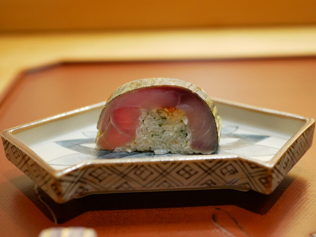 脂ノリノリな鯖は甘みを引き立てる〆方。筑紫昆布が巻かれると落ち着いた旨味で伝える。 味に深みのあるプリックポンの独特な辛味が全体を引き締めてくれます。