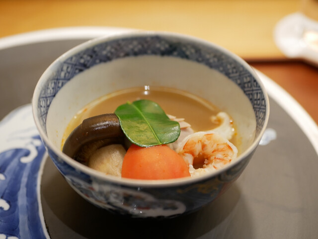 ●温椀:トムヤムプー 香箱蟹(兵庫)、海老芋(富田林) 1人1杯分という手間ひまかけた贅沢、よく混ぜ合わせて頂きます。