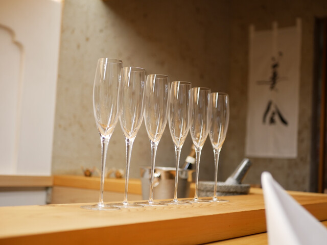 ワイングラスが整然と並んだ光景に圧倒されるとともに期待が高まる