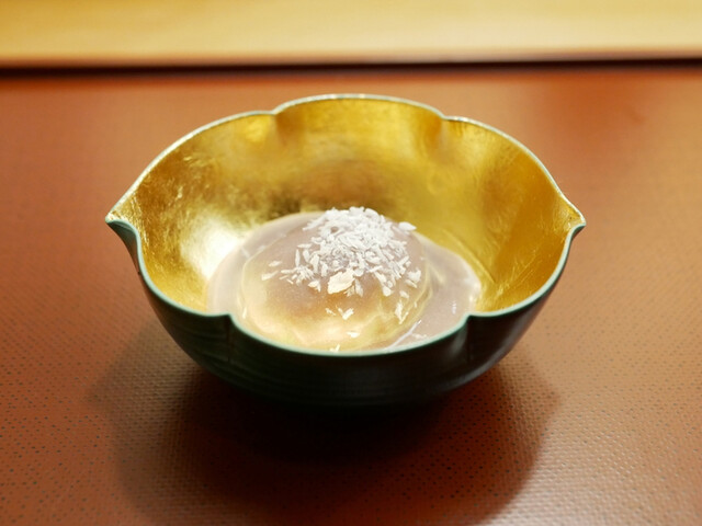 ココナッツの甘みとヨモギの濃密なコク深い味わいに、軽く乗せられた山椒が味を引き締める。 お茶に合い、さっぱりとした〆。