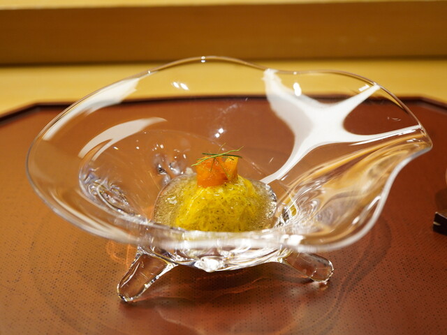 燻製とした答志島トロさわらの旨味をバイマックルーのトロみに菊花とともにハーブジュレで包み込み、タイの面持ちがありながら綺麗な香りを重ねて引き立つ品格。柿の果実で色付けする季節のアクセント。