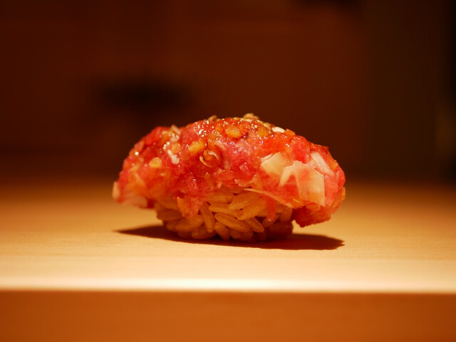 ポーションは小さくてもシャリが粒感を伝えてくれ、そこに纏う酢の香りが柔らかく主張して、噛むほどにもちもちと甘みを膨らませる印象。