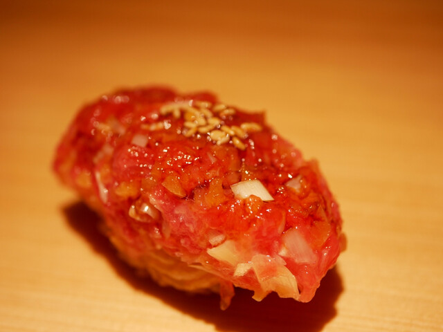 鉄の味わいと赤酢のシャリの酸味が同じベクトルで立ち上がり、綺麗な相乗且つ力強い旨味へと着地。これは直球で美味い!