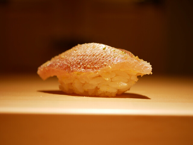 酢朧〆で脱水されつつもむっちりした身、圧をかけると旨みが柔らかく広がり、シャリは酸味から甘みに表情を移り変え、引き立つ美味しさを表現! 江戸前らしい古典的で綺麗な仕立て。