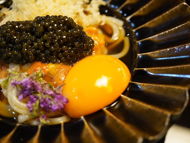 徳島の半田そうめんには雲丹と卵黄を解いたものを絡め、さらにキャビアを添えて。