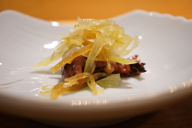 季節ものとして、京都物集女(もずめ)産の極上筍と合わせる共水うなぎ。繋ぎ留める餡にも鰻のお出汁を用いて、筍の甘みと香りにパリッとした身の旨味が自然と共鳴。纏わせた炭火の薫香が餡に宿り、鰻の味わいと合致させる見事な一品にいきなり魅せられる。