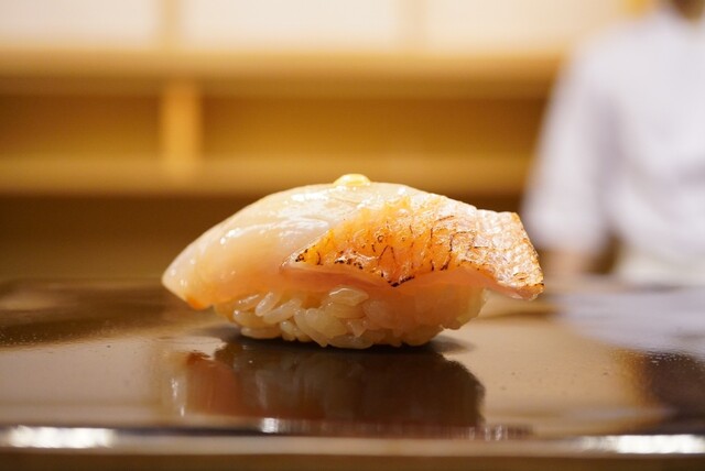 ◇金目鯛 口に入れた瞬間に炙った香りが鼻から抜けて、思わず感じる吐息に悶絶! 噛みしめる度に脂に乗せた旨みが滲んで、カラシを起点として味のバランスを形成させる。 金目鯛の美味しさを余すことなく表現した素晴らしき握り。