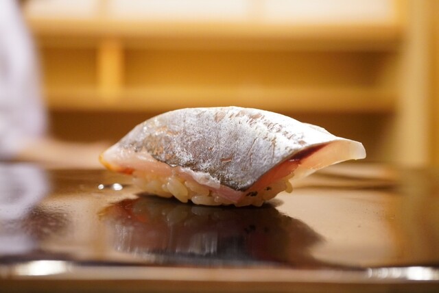 ◇小鰭 カドのないシャリの酸味と酢〆の酸味が同調し、踏み込むたびに抜ける風味が身の旨さを魅せつける。 沈み込むシャリに含ませた空気感、江戸前の粋を込めた初球に思わず陶酔する。