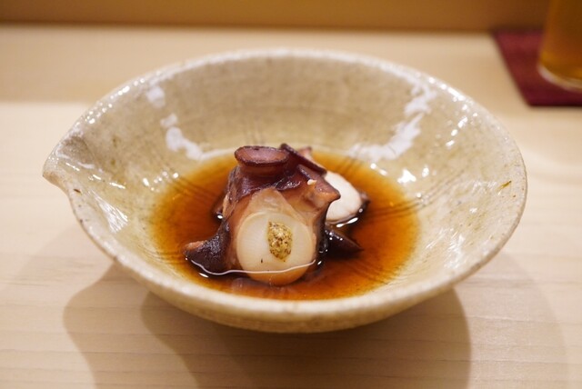 カラシをアクセントに、甘すぎず蛸の味を主張させ、咀嚼の一つひとつに香りが心地よく込み上げる。 皮はゼラチンのように柔らかく、身は食感を持たせた絶妙な火入れ。