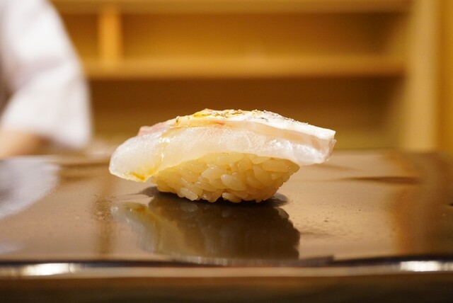 ◇春子鯛 血鯛の幼魚。 むっちり絶妙な脱水加減はややえんみ方向に旨味を導き、シャリの酸味で引き立つキリッとした美味しさ! 江戸前鮨として綺麗なフォルムと味わいを見事に一致させる。