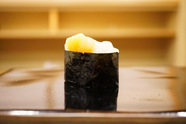 ◇紫雲丹:大千(青森) 穏やかな口どけはクリアなミネラルとなり、仄かな磯感がシャリを染めて形成する綺麗な海の味わい。 名だたる高級店よりも真っ先に目を付け、使用していた杉田氏の目利きが光る立派な雲丹。