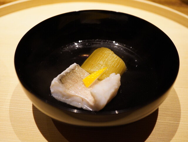 この日のお椀は「イトヨリダイ」。クリアな昆布出汁のなかにも実直な旨味を反映させ、焼き茄子の焦げた香りと甘みでバランスを形成。僅かに柚子を纏わせると澄んだ中にも奥深さや立体感を自然と形づくる。