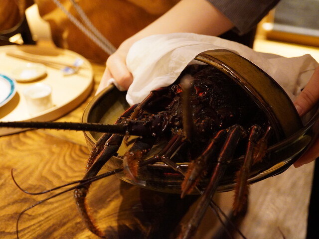 披露されたのは立派な焼津産の活き「伊勢海老」。海老味噌のえんみと繊維にみなぎる甘みの均衡がつくる味わいが堪らない。