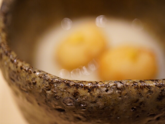 混ぜ込んでも素材同士は決してぶつからずに違和感なく重なり合う。 蒸し餡の甘みを引き立てるカラスミのえんみ、それらを軽やかに持ち上げる山葵の清涼感。フレッシュさを残したままの山芋の皮の食感と香ばしさが全体を包むように調和させる。 残るお出汁を啜るとアイドリングが終えているのにふと気付かされる。