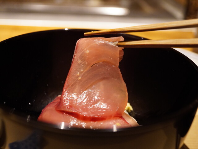 ごく薄い切り付けなのに堂々たる旨さを放つ鰤。
