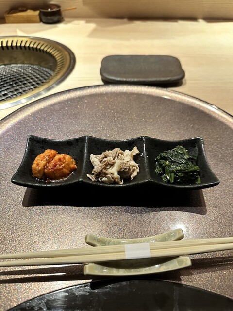 最初に提供された「長芋・冷しゃぶ・ほうれん草のナムル」は、それぞれ異なる味と食感が楽しめる一皿です。長芋のシャキシャキ感、冷しゃぶのしっとりした旨み、ほうれん草ナムルのさっぱりとした味付けが絶妙に組み合わさり、期待感を高めてくれます。