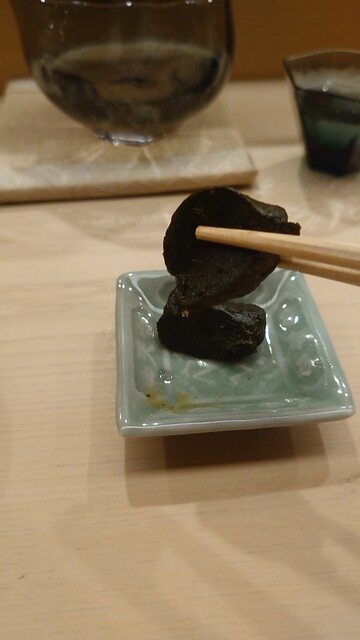 アテ:海老芋 胡麻とカラスミ、積丹半島鰤と皮剥、皮剥の肝、〆鯖、穴子白焼き、白子、鮟肝、新政日本酒(貴醸酒)、筋子、赤むつ塩焼き