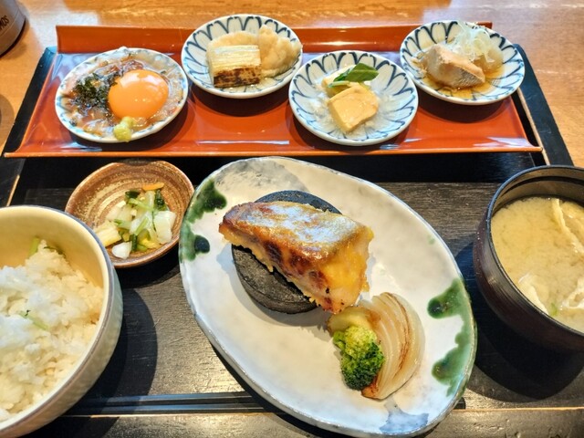 一汁五菜のぶり照り焼きをメインにいただきました。他四菜も魚が主で、中でも鯛刺身+卵黄身が良い!(¥1,800)