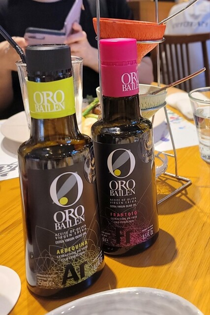 お肉の場合とパンの場合で、二種のオリーブオイルが用意されていて、その隣には三段の薬味の皿が。