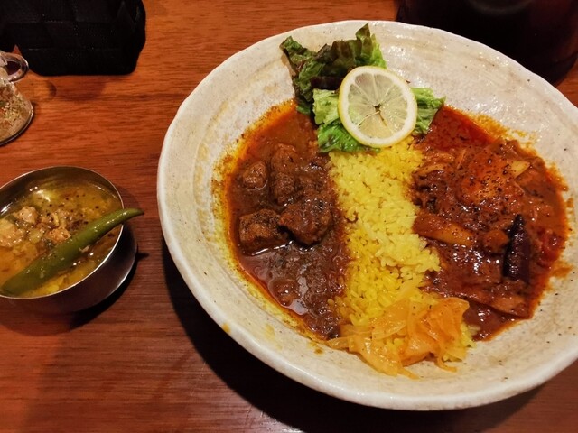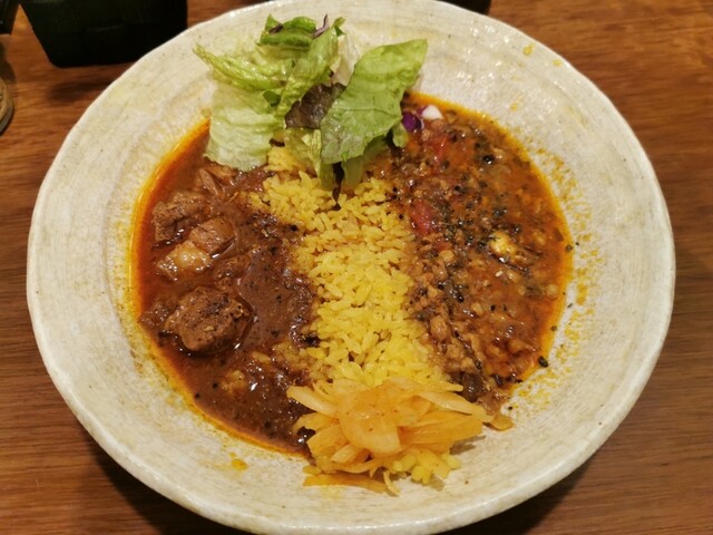 二種のカレー(限定カレー 骨付きマトンカラヒ+魯珈チキンカレー) リフト!