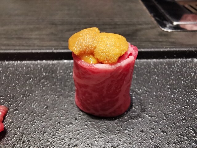 雲丹をしんしんで巻いてあり、鹿児島産の甘い醤油で頂きます。って鹿児島県民だからいつもの醤油ですよ(笑)