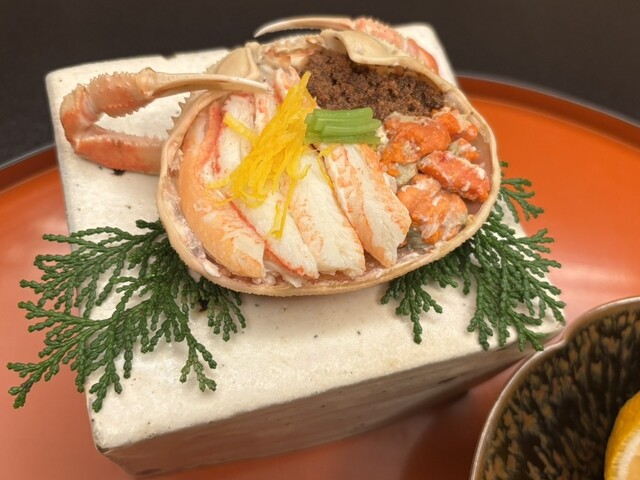 先付はセコガニの甲羅盛りとふぐの白子の柚子釜