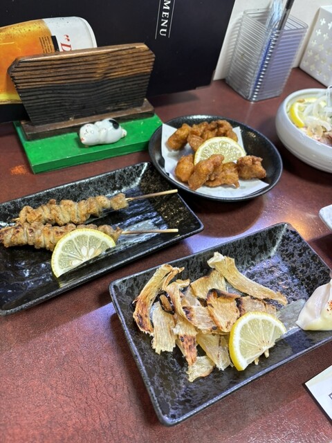 ポテト、鶏皮串、揚げ出し餅、塩だれキューリ、エイヒレなどなどさっさと注文。お客さん次々来るから焦る。