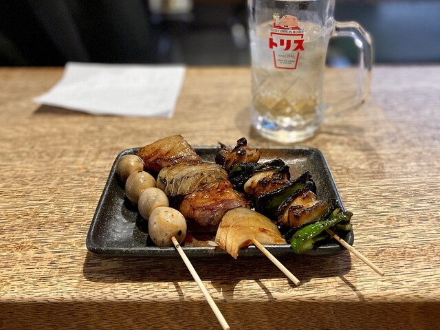 ・イベリコ豚バラ玉ネギ串、うずら玉子串、とり皮ピーマン串