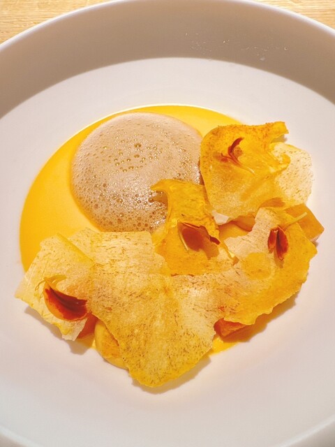 燻製のプリン、カラメルの泡、柿のチップス、柿のソテー、酒麹のクリーム、柿のクリームチーズ、ブランデーとマリーゴールドの花びら