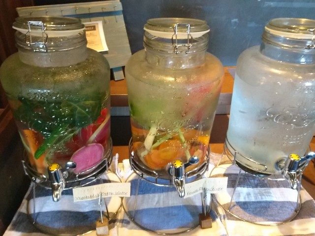 水はセルフですが、野菜フレーバー・果物フレーバーの水もあり、ほんのり香りがします
