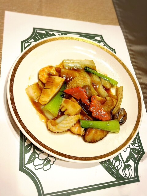 高級食材まこもたけに新鮮野菜と質の良い烏賊や海老を合わせたバランスの素晴らしい一皿です(o^^o)