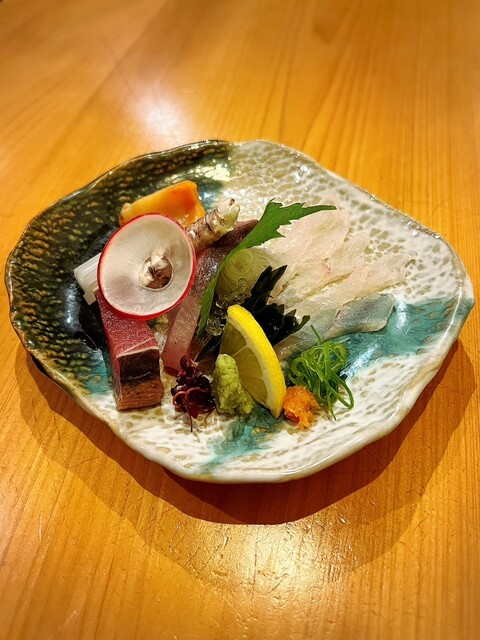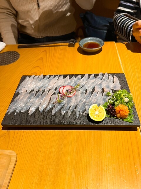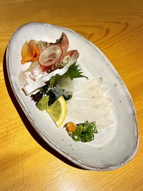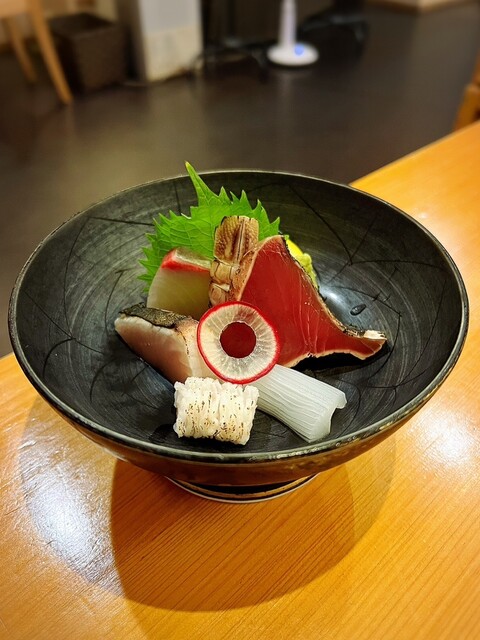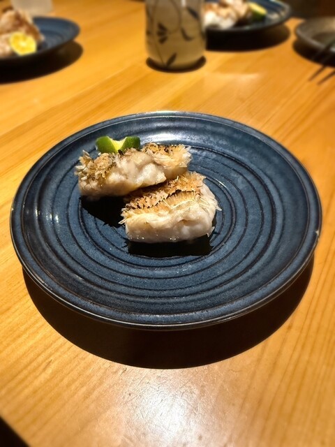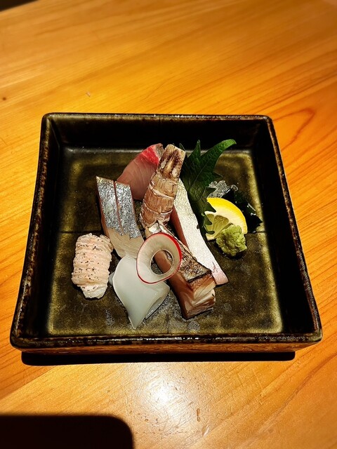 • 左側から時計回りの順に、地穴子炙り、シマアジ、シャコ、カンパチ、鰆の焼き霜造り、水イカになります(o^^o)シマアジとカンパチは特に美味しかったです!!