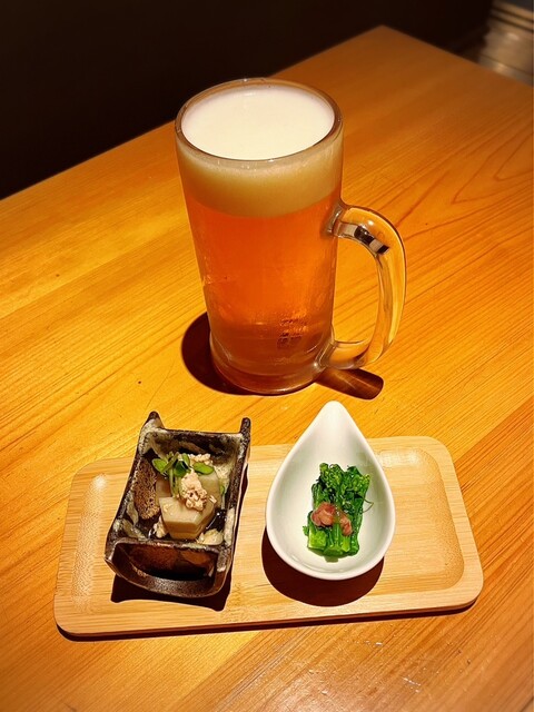 • 生ビールとお通し2品です(o^^o)