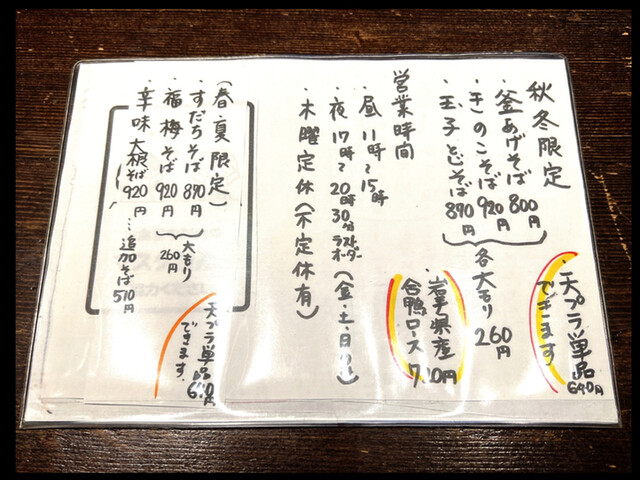 遅い時間でお客さんはおられなかったのでテーブル席に座り、お品書きに目を通しました。