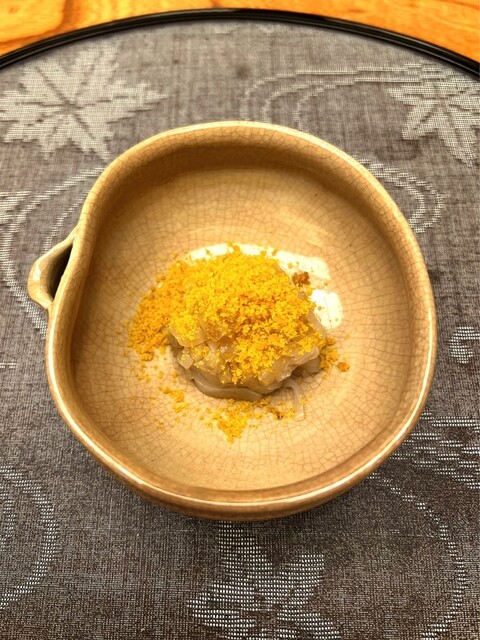 山口県産黒鮪ヨコワ(写真無し)の後に提供されたアオリイカの唐墨添えです(o^^o)