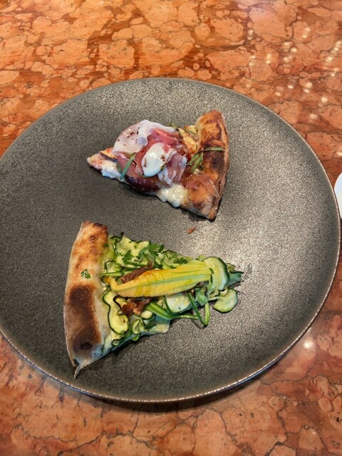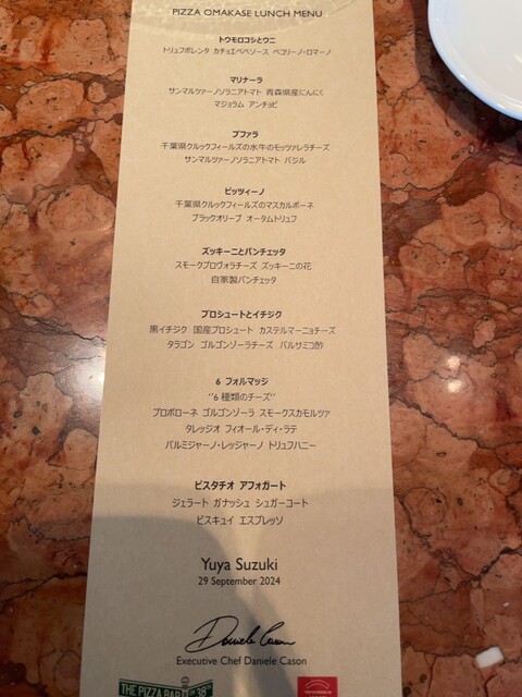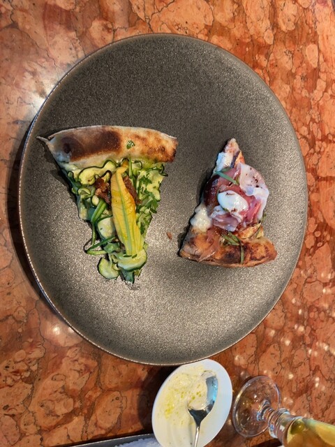 アジアNo.1(世界3位)に数年連続で輝いているピッツェリア。ランチコースの内訳は、メニュー写真の通り。前菜から完璧、クリーミー、甘い、至高。そしてすべてのピザが味わったことないない感覚のトンデモピザ。ピザの概念が全く変わるレベルのものでした。生地が他のどのお店の生地とも全く別物。加水率80%のクリスピー気味な感じだが、その言葉では言い表せないくらいなベクトルのもの。そして全国から取り寄せた新鮮な質の良い食材をふんだんに使った具。特にプロシュートとイチジクのピザは、上品でしつこすぎない酸味が絶妙で常識が覆えされる感じ。その他のピザも、野菜そのものが美味しい感じが伝わってきます。最後のドルチェまで凝っていて最高のコースでした。お土産でいただいたクッキーも柔らかくてレモンが効いてて好きな食感と味でした。