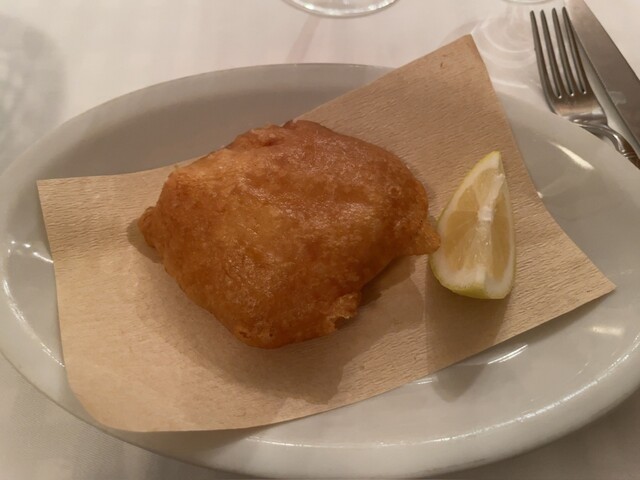 店内はイタリアの写真がたくさん飾ってあっていい感じ。テーブルクロスもおしゃれ。サンジョヴェーゼは奥深い、右回しをすると優しい味わい。左回しをするとよりパンチがある感じ。ポルケッタは塩っぽくて美味しい。焼き鳥を彷彿とさせる味わい。そしてフォカッチャはローマ風っぽく普通のフォカッチャより明らかに塩っぽくて美味しい。ローマ料理はやっぱりしょっぱいもの好きにはたまらない。塩ダラのローマ風フライも優しい味わいのタラを揚げてとても落ち着く感じ。レモンをかけていいアクセント。グリーチャすごいシンプル。カルボナーラからチーズを減らした感じ。ただちゃんとチーズの味はしっかりある。より渋い感じ。ごまかしがないため、パスタの味がそのまま伝わってくる感じ。ベーコンがすごい美味しい。このベーコンがすごいいい感じに仕上げてる。合間に飲むワインもすごく美味しい。右の方がナチュラルで好きかもしれない。サルティンボッカが来るまでに時間があったので、パン(フォカッチャ)のおかわりもいただいた。サルティンボッカはクリームの味わいが家庭的で美味しい。クリームソースがすごい美味しい。しょっぱいフォカッチャと一緒に食べるとアクセントがいい感じ。このフォカッチャ、ハーブというか香辛料というかそのようなものが使われている。それも結構好き。今までのフォカッチャで1番美味しいです。サルティンボッカのこのソース、どうやら白ワインとバターを乳化させたソースで風味をつけるらしい。さすが乳化大国イタリア。フォカッチャをスカルペッタしたらこの甘いソースとフォカッチャのしょっぱさが融合してこれまた良い塩梅に。それにしてもワインが美味しすぎる。グリッシーニも美味しい。グリッシーニとワインの相性も最高ですね。総じて最高のお料理でした。美味しさも満腹感も完璧。1人用にサイズや個数を調節してくれるところもあるがたきです。おかげでこんなに美味しくて幸せなのに、しかも頼む予定以上のものを頼んだのに、予定額より1,500円近く安上がりでした。しかも1番高いグラスワイン頼んだのに。ホスピタリティもすごいお店でもありました。ここ数週本当に美味しいお店が続いていて幸せです。