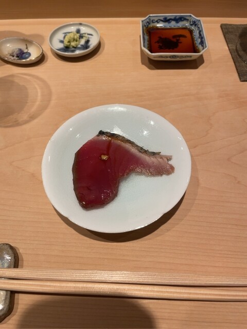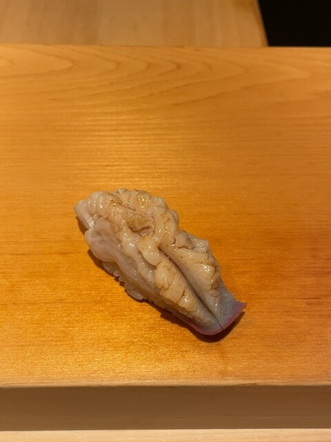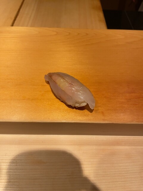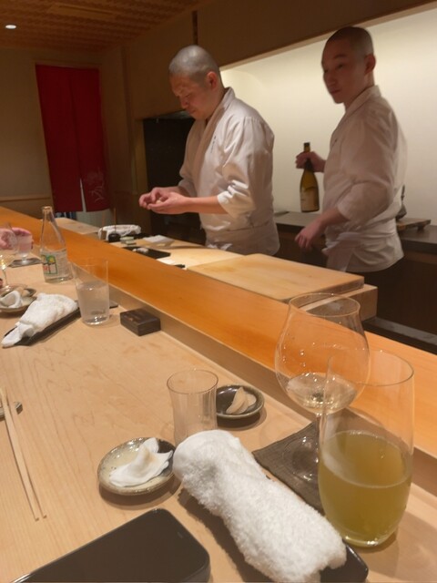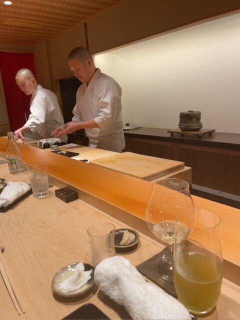 食べログ全ジャンル日本一の水天宮のすぎた出身の大将のお店。白ワインはブルゴーニュの「シャサーニュ=モンラッシェ」。ブルゴーニュのワインだけにブルゴーニュグラスで出てきました。やはりアップル感。辛口目。だいぶ美味しい。1品目、魚のお出汁。これはまぁ普通の魚のお出汁。ミネラルウォーターがちゃんと瓶に入ってますね。隣の距離が狭いので、気抜いたらどっちのドリンクか分からなくなりそう。次、ヒラメとミル貝。お塩とお醤油で食べられるが、やはり魚介類はお醤油ですね。いや、でもヒラメはお塩でも悪くはないかも。でもやはり比べたらお醤油の方がいいですね。次、白子の茶碗蒸し。醤油が効いてておい美味しい。次、いくらとセイコ蟹(ズワイガニのメス)。カニといくらの組み合わせが美味しいし、どこかゴマっぽい味も効いててかなり美味しかったです。それにしてもワインが美味しい。鼻に残る漢字の後味が堪らない。ご飯がしてから一緒に一緒に食べるとやはり空酒以上に美味しい。次、カツオ。カツオは好きではないが、マスタードだか辛子だかみたいなものがついてて美味しく食べれた。この組み合わせがいいのかも。次、イカの磯巻き。なかなか美味しい。次、あん肝の味噌漬け、牡蠣、シャコの三点盛り。あん肝最高に美味しい。あん肝の味がだいぶ強いんで、シャコから行った方が良いかも。カキはよく噛んだ方が味が出てくる。シャコは赤海老ほど味が強くないかも。隣の常連と多少内容が違うみたい。次、ネギマグロ焼き。焼き鳥みたいな見た目ですがしっかりマグロの味ですね。寿司1巻目、定番のコハダ。季節的に脂が乗ってきても良い頃のようだが、そんなに乗っていないそうなので、そんなに強く締めていないような話をしていた。1時間後に寿司が始まりましたね。寿司2巻目、淡路島のシロアマダイ。名前の通り甘味がある。3巻目、カワハギ。カワハギめちゃくちゃ美味しいです。香ばしい。ジューシー。脂ノリノリ。4巻目、中トロ。やはりトロは安定の美味しさですね。相変わらずトロけるジューシー。ワイン2杯目はムルソー。スッキリ樽が効いている感じ。やはりこっち(ムルソー)の方がボディがあるしっかりした感じ。アルコール感が強めなんで、モンラッシェの方が好きかも。5巻目、ホッキ貝どこかクリーミーで食べやすいですね。次は、赤身漬け。赤身の方が血感がある。しばらく後の後味が良い。6巻目、カスゴ(真鯛の稚魚)のコブ締め。これも後からくる味が酸味を感じて良い。次、大トロ。やはり1番溶けるしジューシー。生クリームみたいです。余談ですが、このお店。肉屋田中のボス田中さんも2ヶ月に1回くらい訪れるそうです。7巻目、アジ。これもすごい美味しいです。8巻目、サワラ。燻製というかアーモンドっぽい味が効いているがこれはなんだろうか。美味。サワラ撮り忘れました。すいません。9巻目、エビ。温かいです。やはり全体的に後からじんわり効いてくる味系。噛めば噛むほどという感じ。10巻目、アカウニ。ウニもとろとろで美味しいですねー。お寿司最後の11巻目、アナゴ。アナゴは身が崩れるほど柔らかい。そして、次は玉子焼きとシジミのお湯。シジミのお湯は美味しいですねー。お茶も濃厚でおいしゅういただきました。